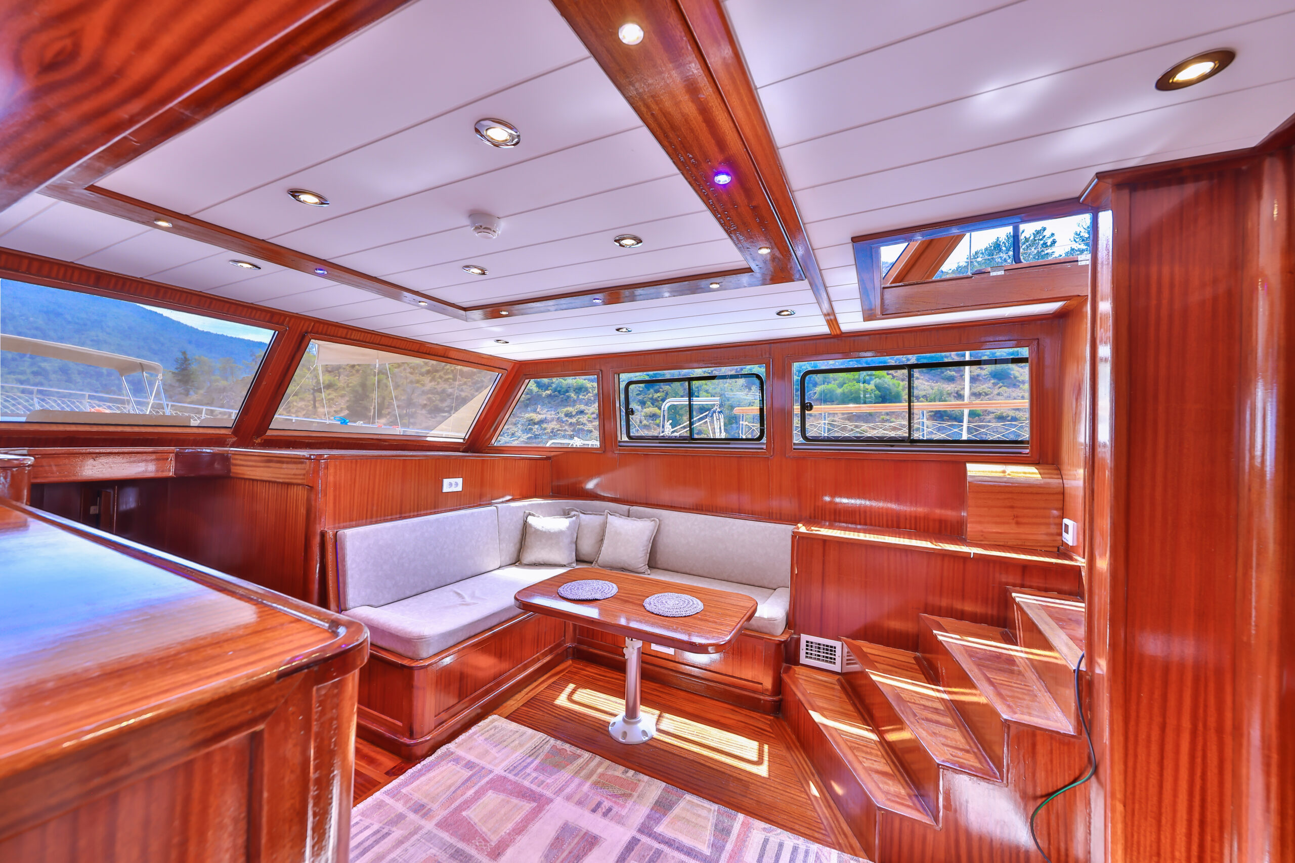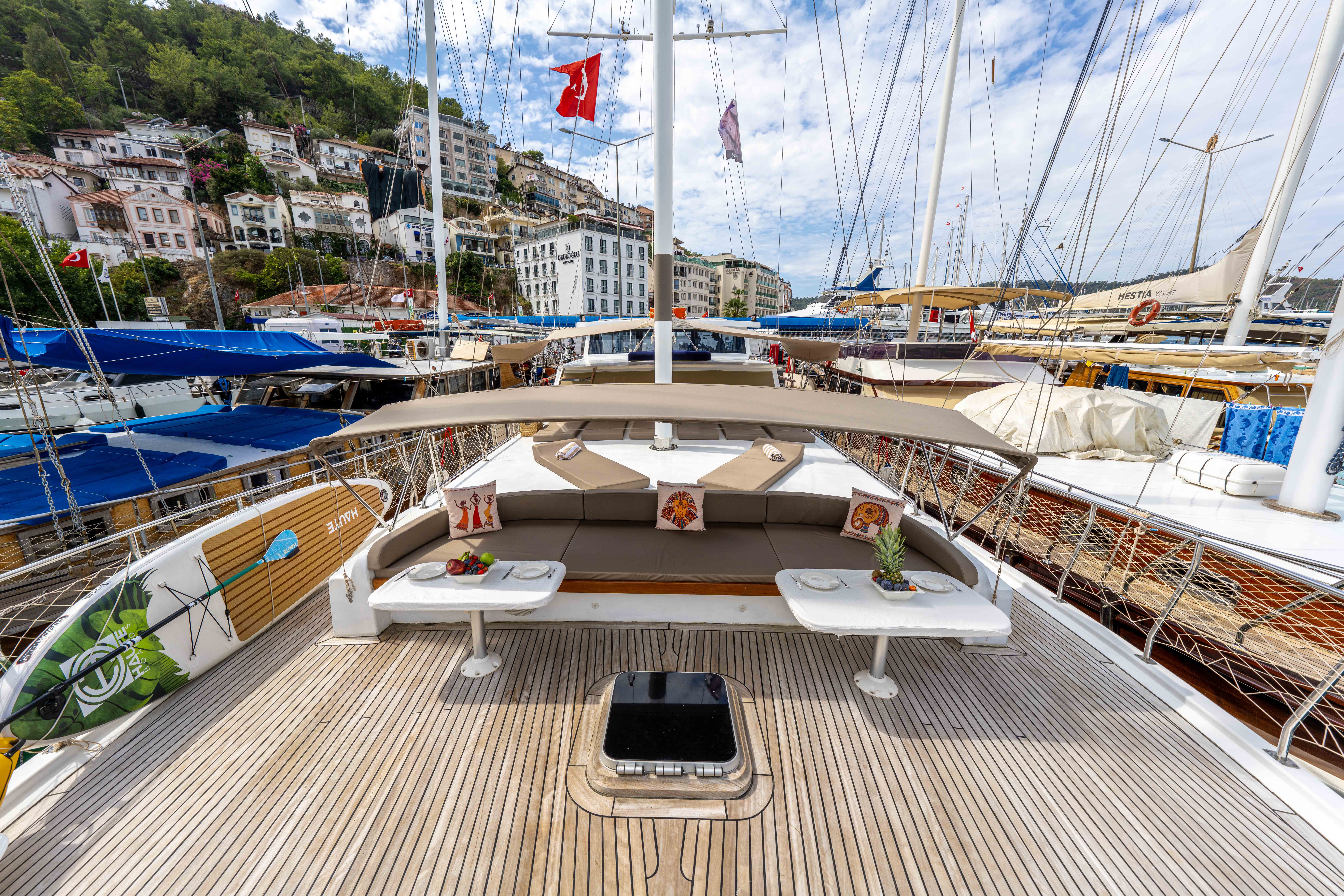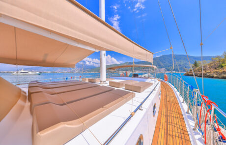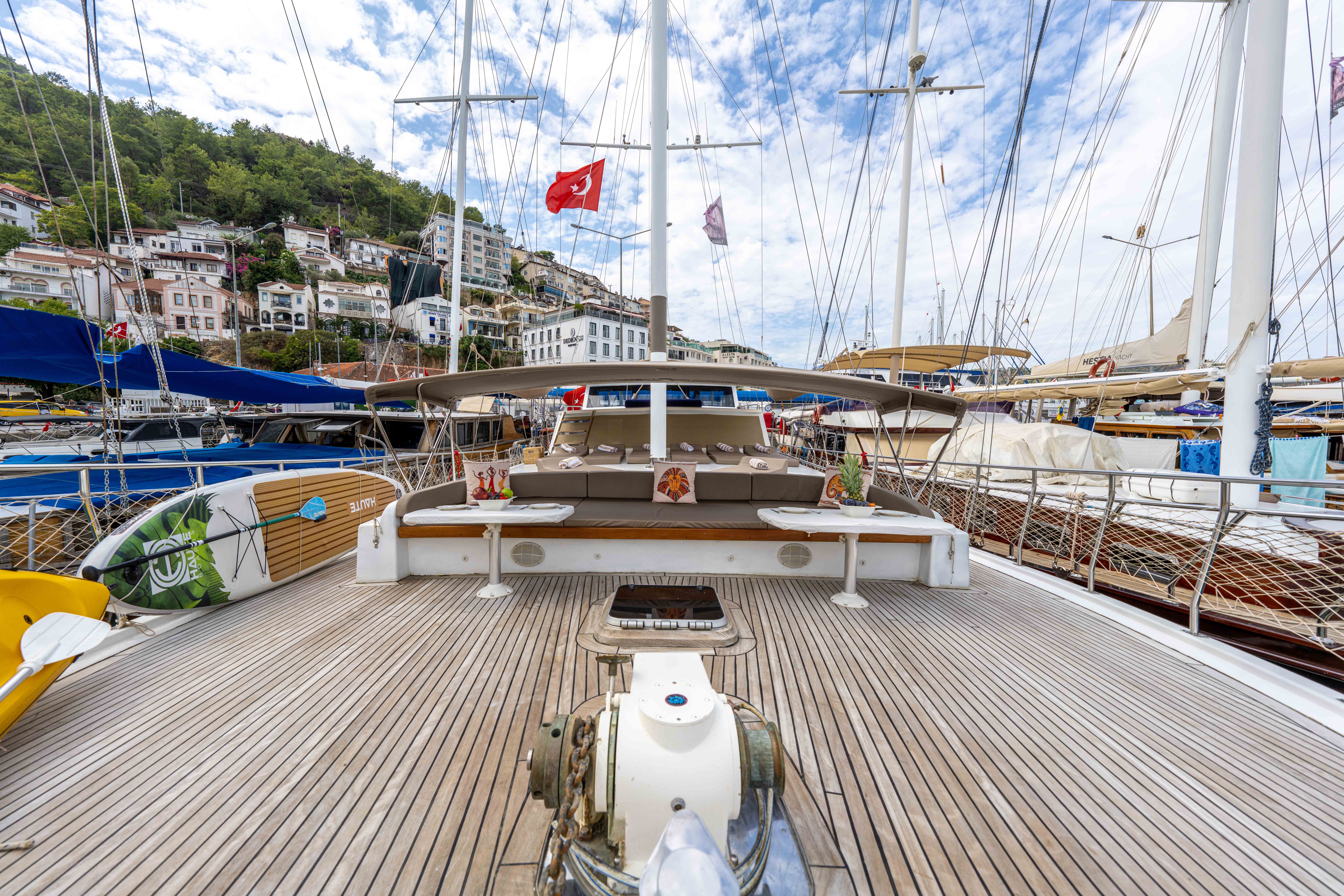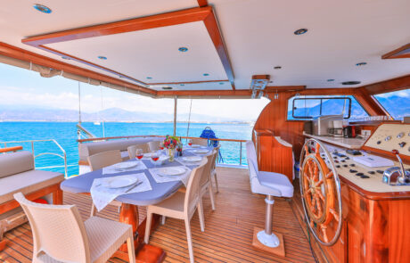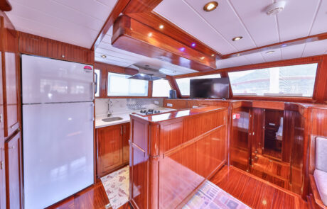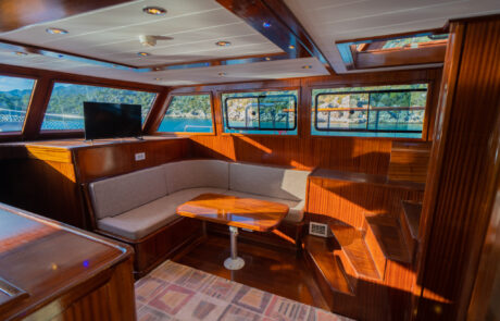 Kasapoğlu 6’nın kıç güvertesinde oturma grubu, masa ve bar bulunmaktadır. Bar içinde buz dolabı, buz makinesi, filtre kahve ve Türk kahvesi makinesi mevcuttur. Geniş salon bölümünde oturma grubu, masa, bar, mutfak, TV ve klima ile zengin bir yaşam alanı sunulmaktadır. Ayrıca, 3.20 metre uzunluğundaki Zodiac bot ve 20 HP kıçtan takma motor ile su sporları ve keşif gezileri için idealdir. Şnorkel, palet, makarna ve pedalboard gibi ekipmanlar, misafirlerin su keyfini artırmak için temin edilmiştir. Konforlu tasarımı ve geniş donanımıyla Kasapoğlu 6, deniz tutkunları için unutulmaz bir deneyim sunmaktadır.
