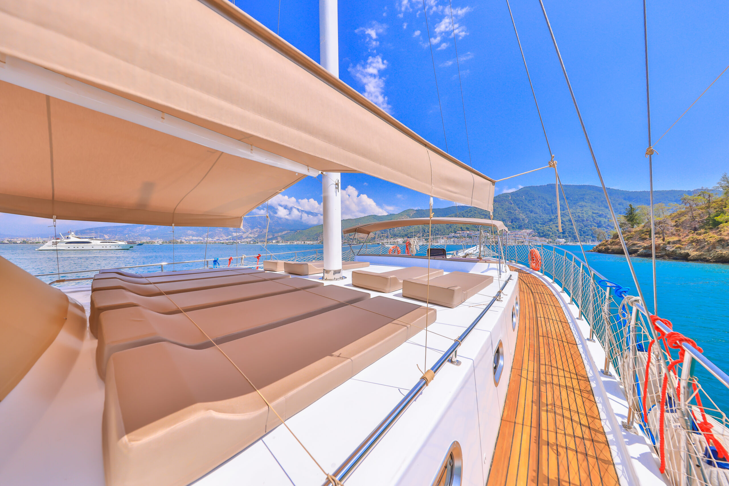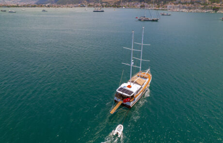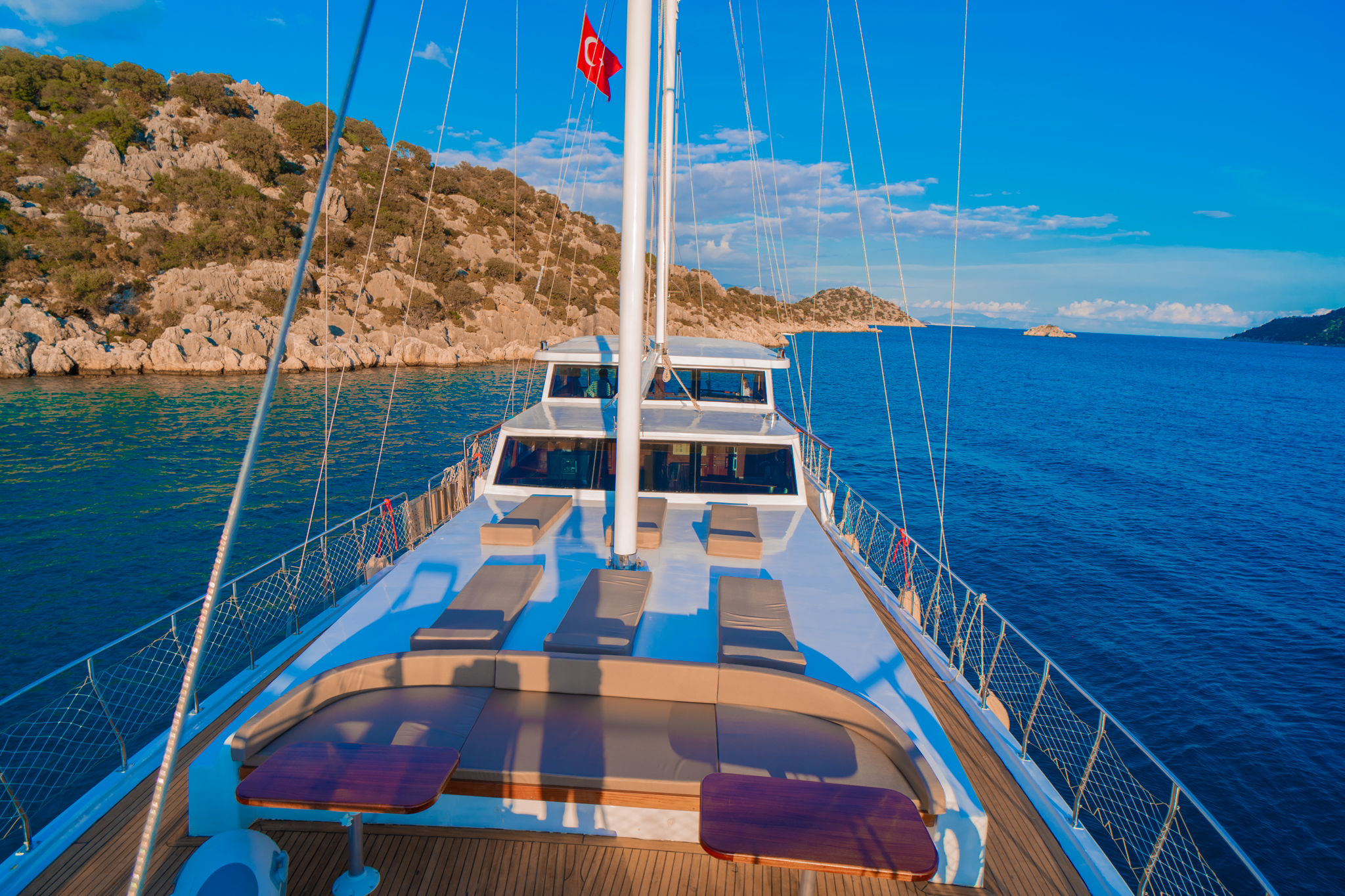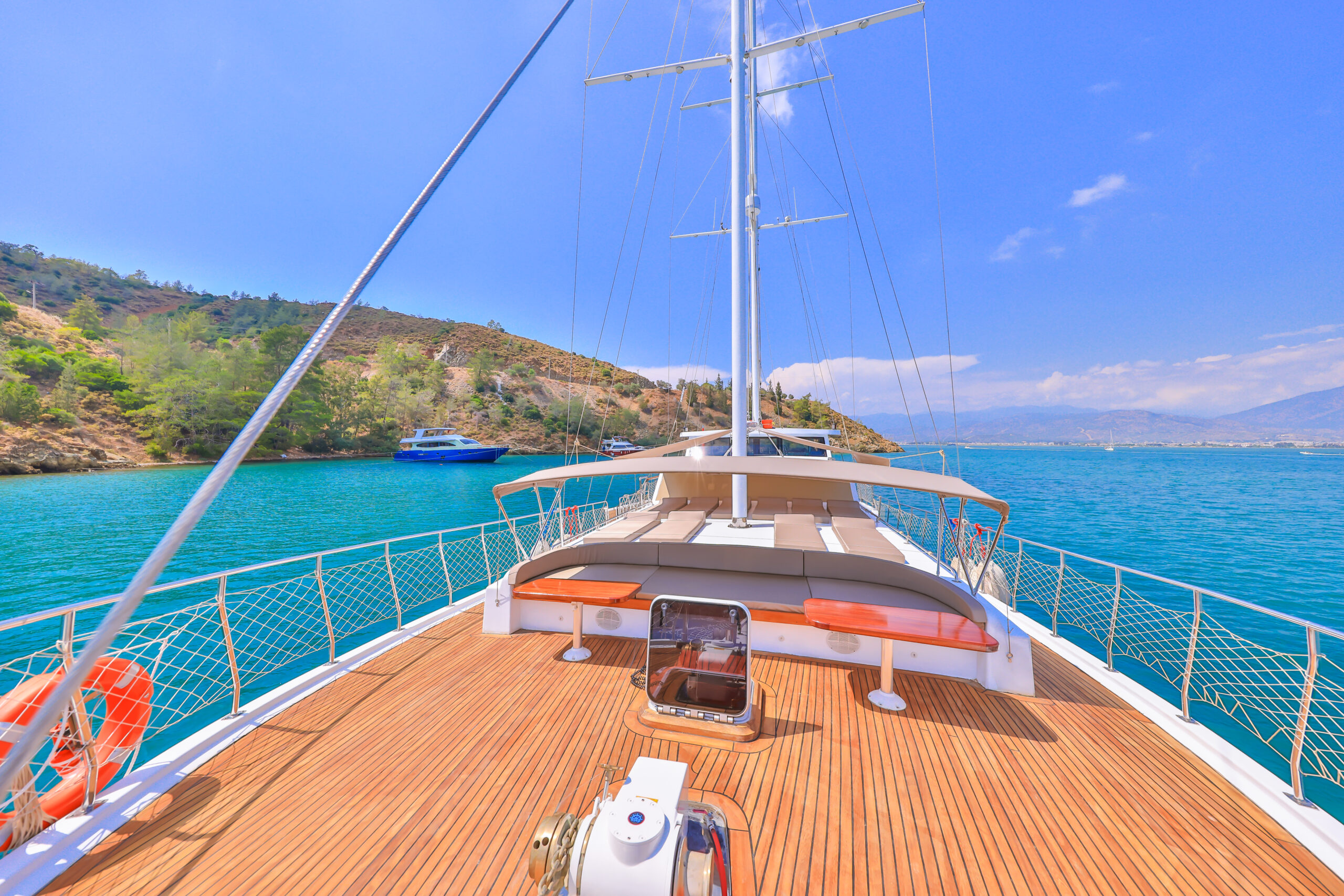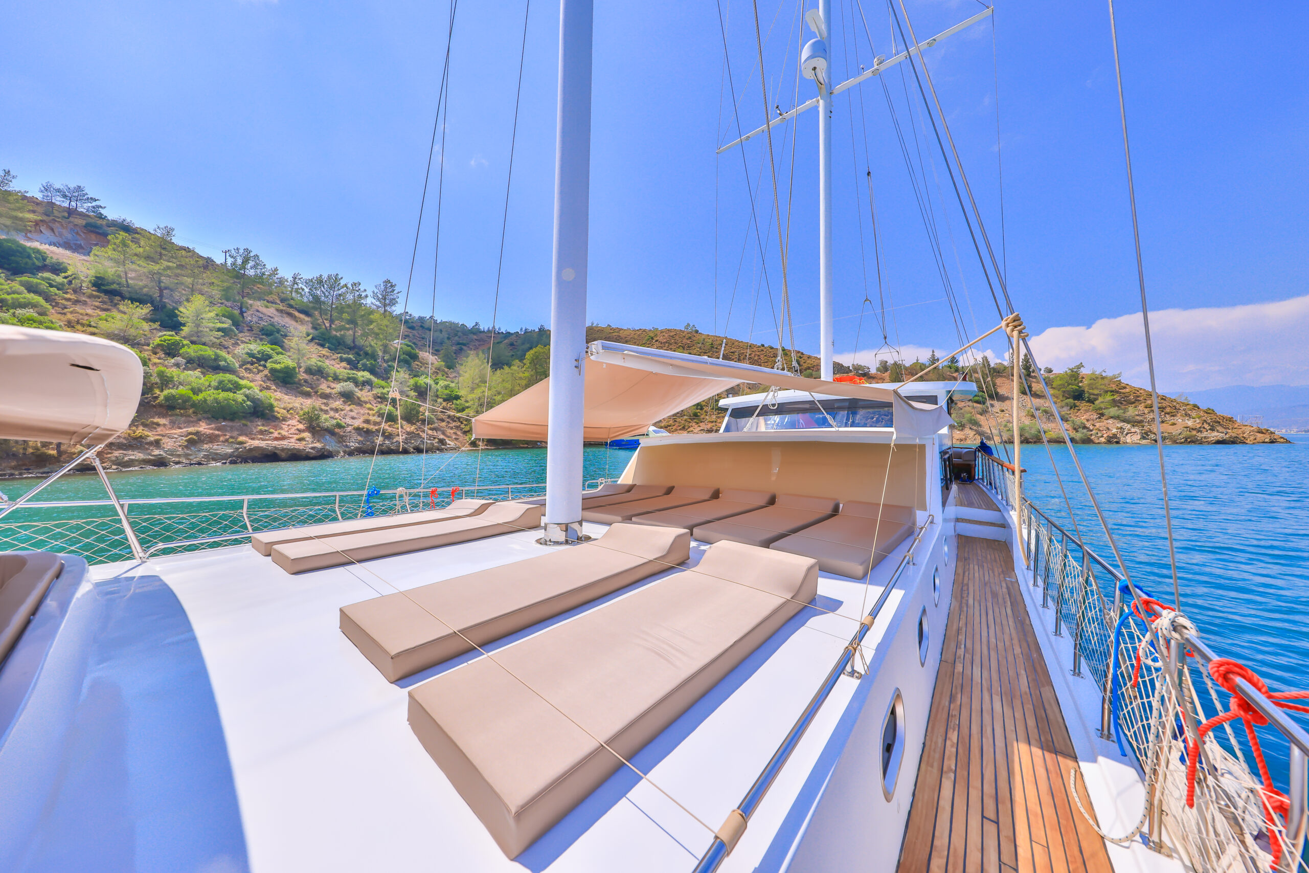 Kasapoğlu 6’nın kıç güvertesinde oturma grubu, masa ve bar bulunmaktadır. Bar içinde buz dolabı, buz makinesi, filtre kahve ve Türk kahvesi makinesi mevcuttur. Geniş salon bölümünde oturma grubu, masa, bar, mutfak, TV ve klima ile zengin bir yaşam alanı sunulmaktadır. Ayrıca, 3.20 metre uzunluğundaki Zodiac bot ve 20 HP kıçtan takma motor ile su sporları ve keşif gezileri için idealdir. Şnorkel, palet, makarna ve pedalboard gibi ekipmanlar, misafirlerin su keyfini artırmak için temin edilmiştir. Konforlu tasarımı ve geniş donanımıyla Kasapoğlu 6, deniz tutkunları için unutulmaz bir deneyim sunmaktadır.