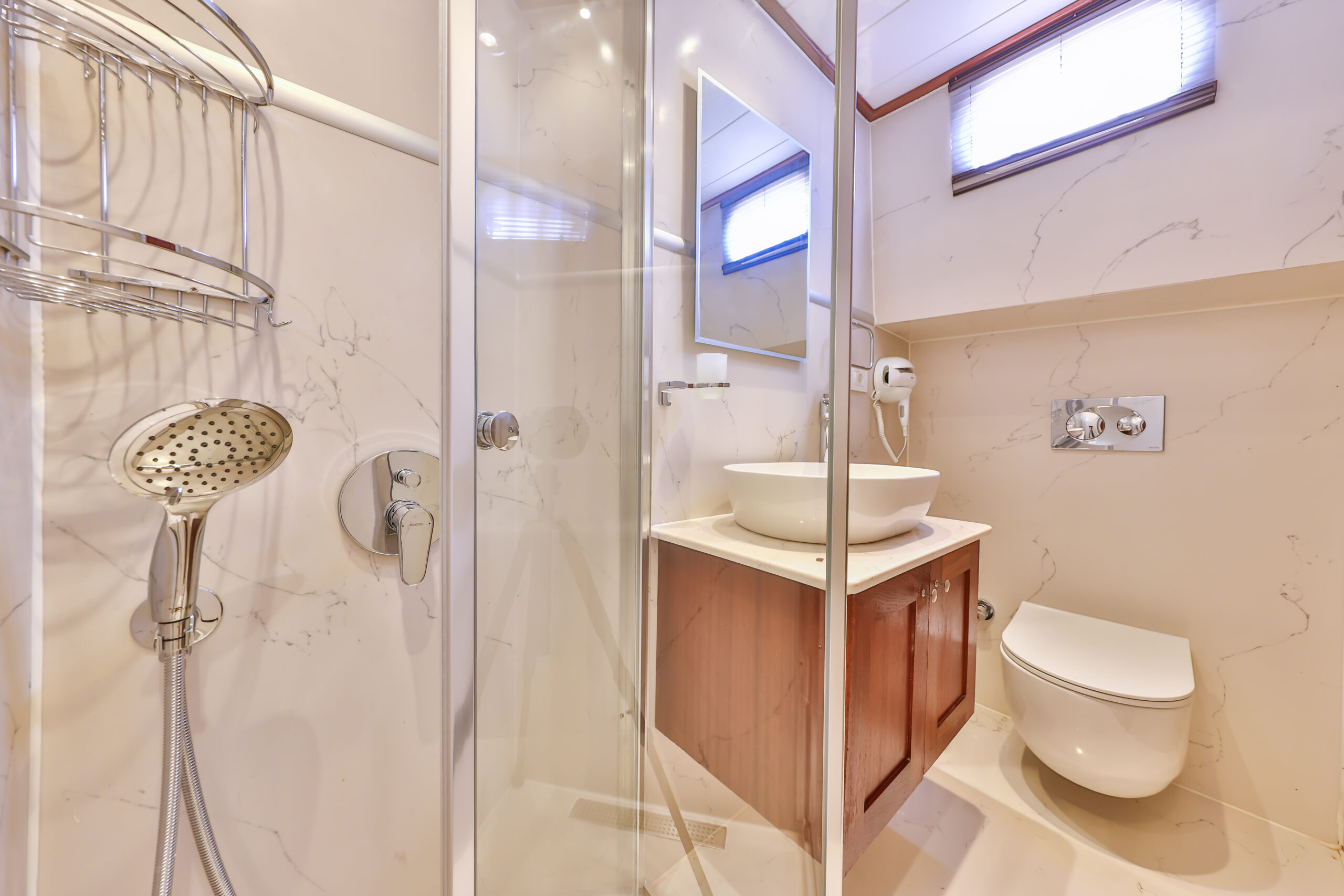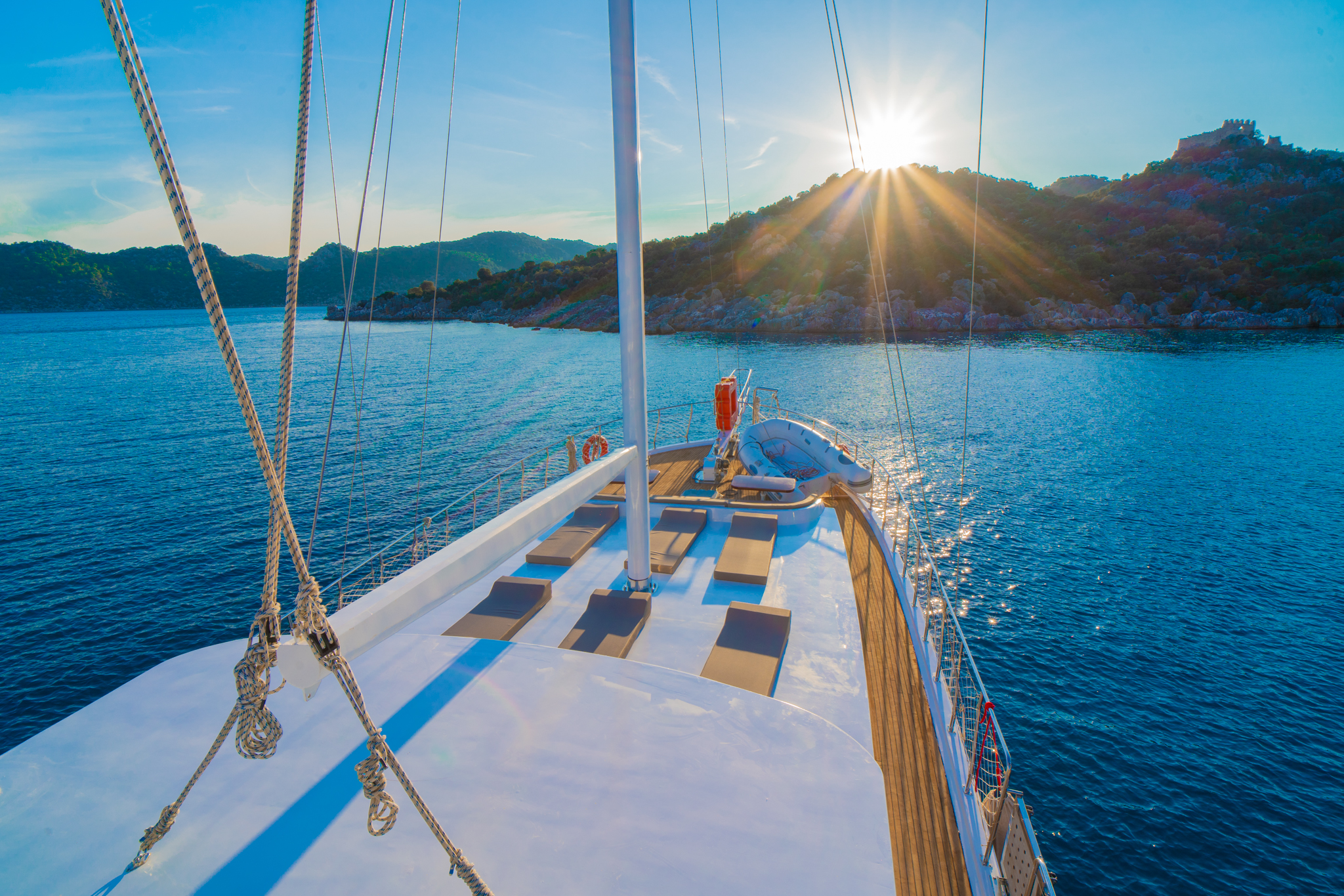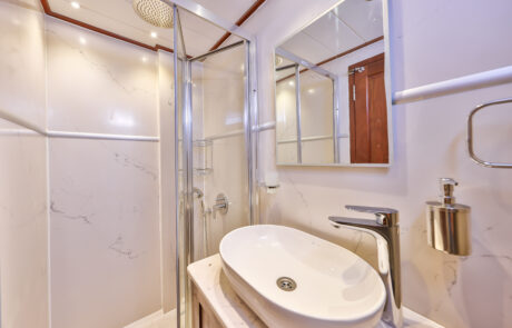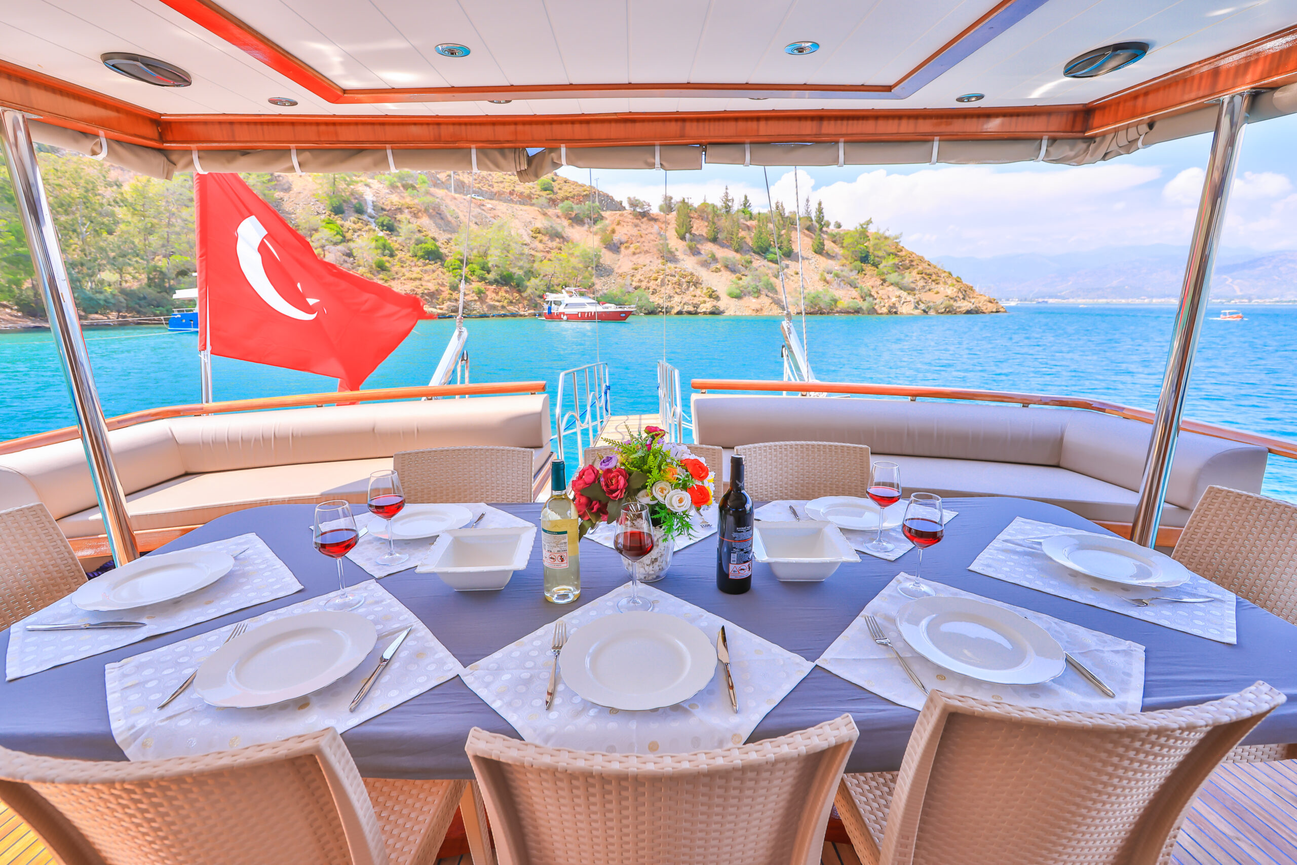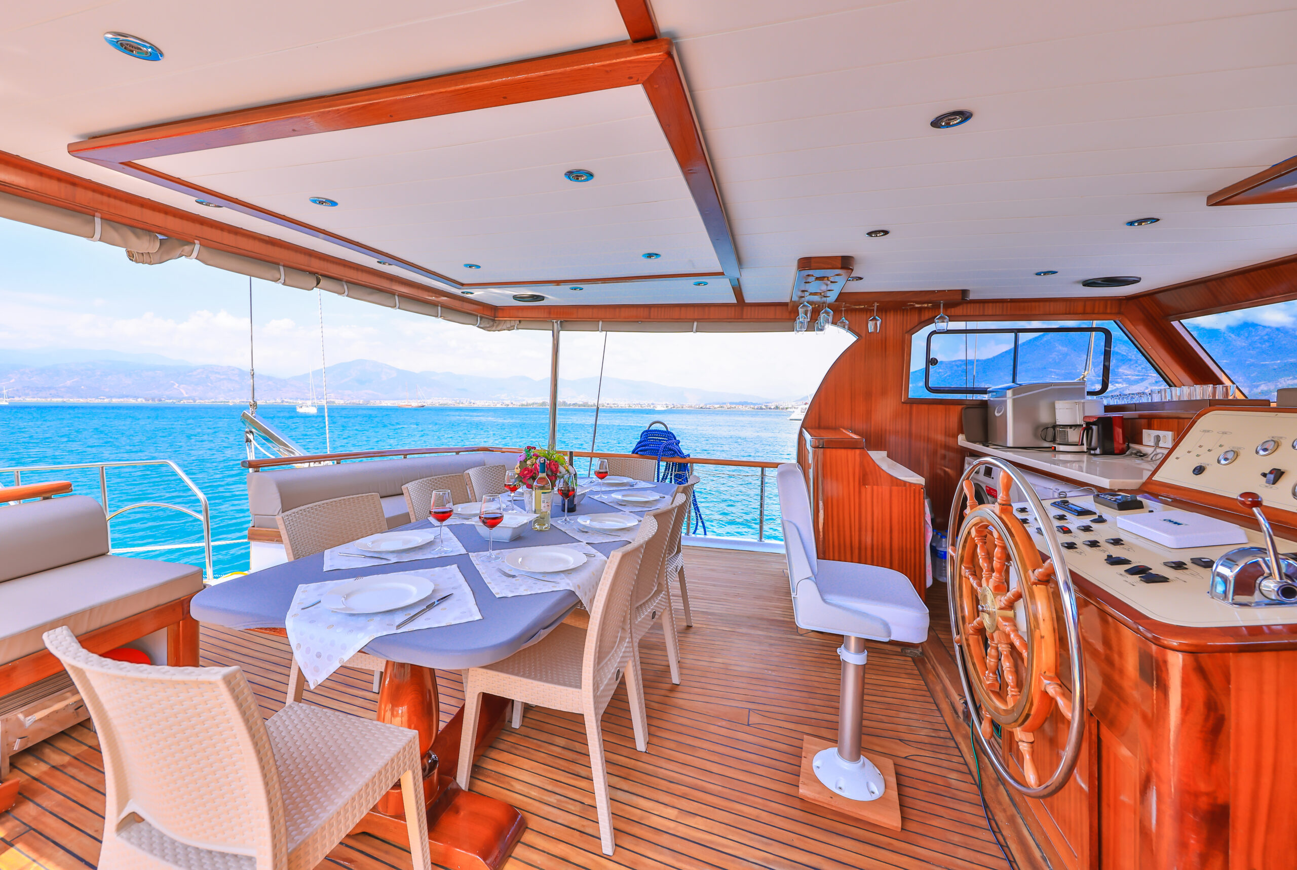 Kasapoğlu 6’nın kıç güvertesinde oturma grubu, masa ve bar bulunmaktadır. Bar içinde buz dolabı, buz makinesi, filtre kahve ve Türk kahvesi makinesi mevcuttur. Geniş salon bölümünde oturma grubu, masa, bar, mutfak, TV ve klima ile zengin bir yaşam alanı sunulmaktadır. Ayrıca, 3.20 metre uzunluğundaki Zodiac bot ve 20 HP kıçtan takma motor ile su sporları ve keşif gezileri için idealdir. Şnorkel, palet, makarna ve pedalboard gibi ekipmanlar, misafirlerin su keyfini artırmak için temin edilmiştir. Konforlu tasarımı ve geniş donanımıyla Kasapoğlu 6, deniz tutkunları için unutulmaz bir deneyim sunmaktadır.
